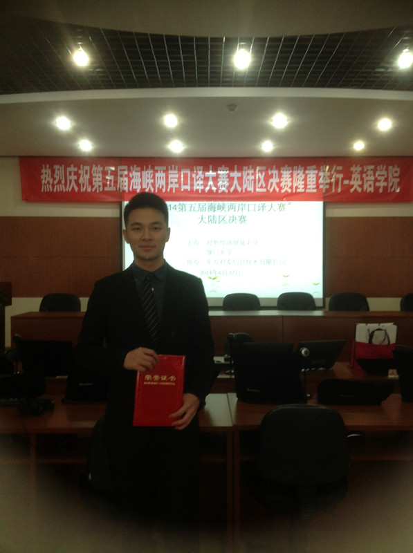 在此前的“第五届海峡两岸口译大赛华南区赛”中,陈黎辉同学表现优异,获华南赛区一等奖。据悉,从今年起组委会除设立大陆赛区和台湾赛区外,特别增设了香港赛区、英国赛区等若干海外赛区,在全球范围内遴选口译选手。