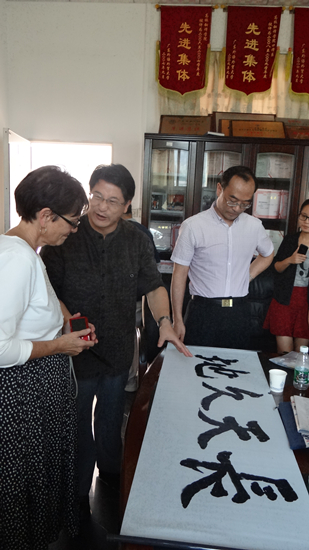 座谈会最后,赵军峰向Susan介绍了茶文化与中国书法艺术。李明为表示对Susan的欢迎,随即挥毫泼墨,写下“地久天长”四个大字赠与Susan,意为与贵宾友谊地久天长,赵军峰也留墨纪念。Susan表示要尝试学习中国书法,并称赞这是一门高雅艺术。随后,各位老师和Susan合影留念,整个座谈会在轻松、友好的氛围中结束。