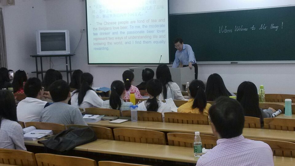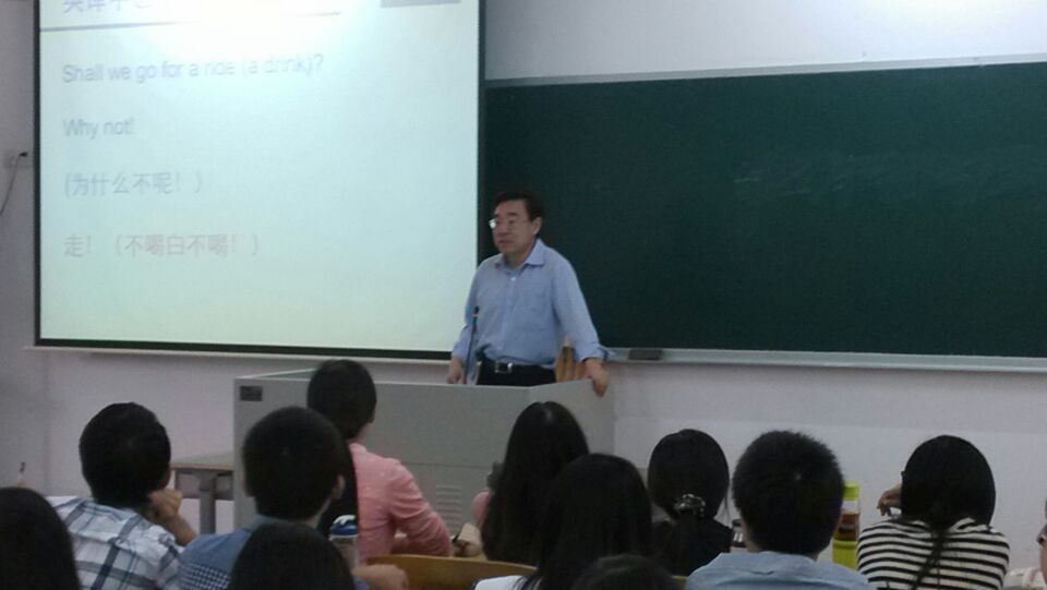黄友义副局长此次授课的题目是《全球化时代的翻译及口译的基本训练》。在课件中,他结合自己多年来丰富的实战经验以及见闻,在密切联系跨文化交际这门课的主题的前提下,展示了大量的实例,详细地论证了他对翻译的深刻见解,分享了他从当今翻译工作中发现的一些不足。