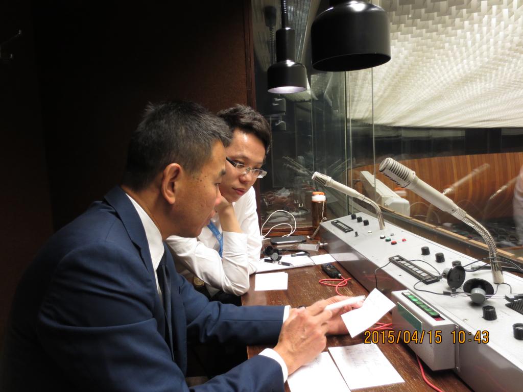 口译处中文科资深译员吴杰在会场同传厢内指导学员