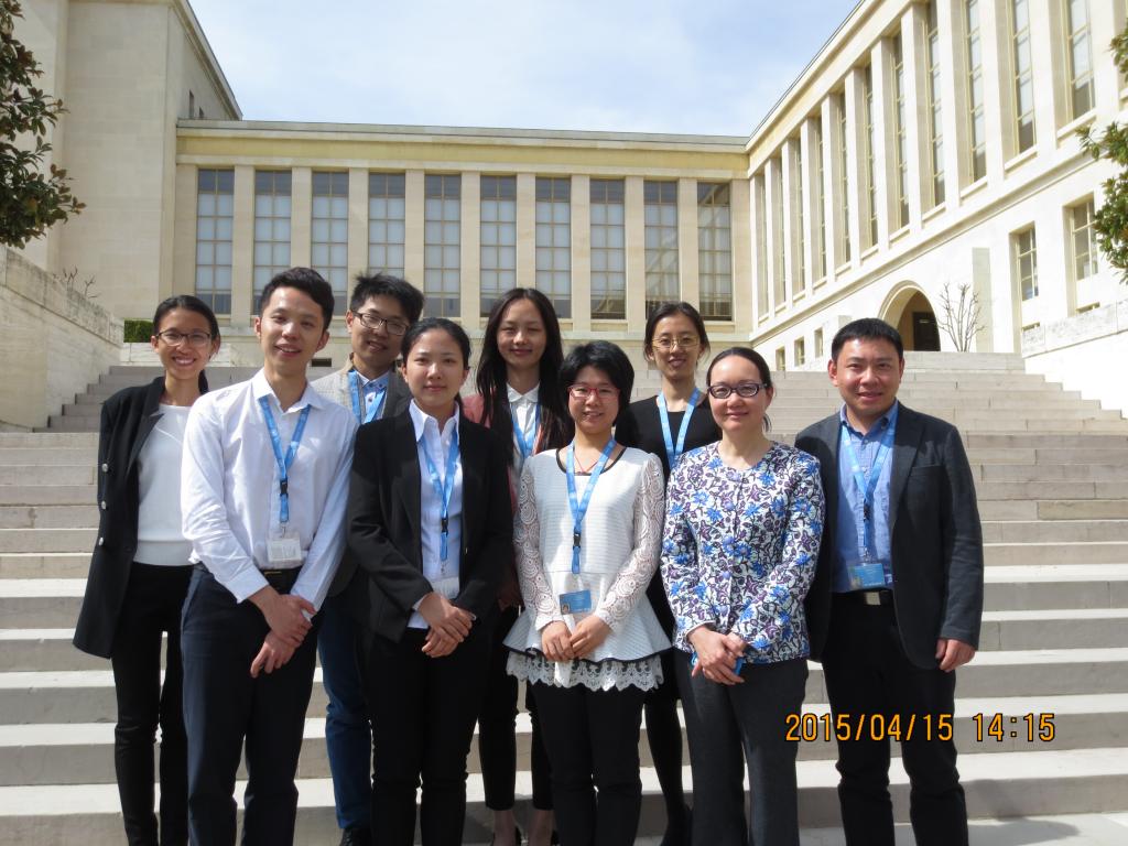 2015年4月13日至17日,广外国际会议传译证书班2013级七名学生在高级翻译学院副院长詹成教授的指导下,赴联合国日内瓦办事处口译处进行为期一周的实习。在实习期间,七名同学参加了致命自主武器系统特定常规武器专家会议、贸易与发展会议全球初级商品论坛和残疾人权利公约残疾人教育权利会议,进入万国宫会场同传厢内进行实战演练。