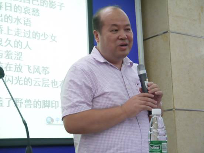 上午的朗诵会上,老师与学生们诵读了多部优秀翻译作品。在教师场,朗读的作品包括资深翻译家冯之林译作苏童的《西窗》、笔译系主任褚东伟翻译刘春的《北京爷们》、康志洪老师翻译林培源的《躺下去就好》、张保红老师翻译黄礼孩的诗歌《春分》及《西藏来信》、外籍教师Timothy Huson翻译言早西《补鞋匠》及英文学院翻译系许勉君老师翻译铁凝的作品《伊琳娜的礼帽》,英文学院方开瑞教授译作丰子恺《散沙与沙袋》。外籍专家Fraser Sutherland、Stephen Rake等作了点评。作为本次活动负责人之一,褚东伟老师朗诵了其精心挑选的《北京爷们》(原作者为刘春),并在研讨会上分享了部分外教的翻译心得,多角度分析解读作品,语言流畅地道,朗诵声情并茂,英语纯正,得到与会者阵阵掌声。