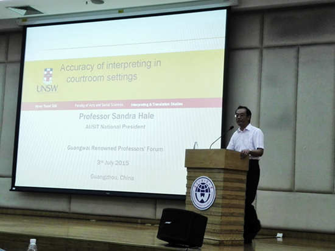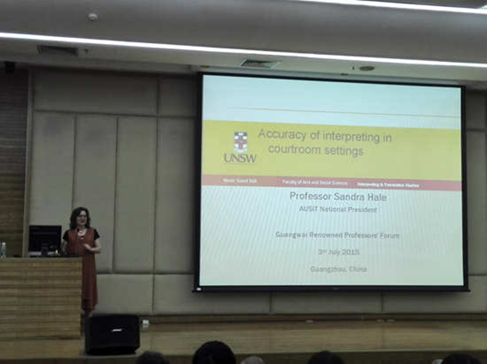 7月3日下午,澳大利亚新南威尔士大学教授、澳大利亚翻译协会会长Sandra Hale在图书馆报告厅为广外师生带来了题为“Accuracy of Interpreting in Courtroom Settings”(法庭口译中的准确性)的演讲。该讲座吸引了许多来自法律英语专业的同学、老师以及国外学者。出席本次讲座的院领导有高级翻译学院院长赵军峰教授、副院长李明教授等。
