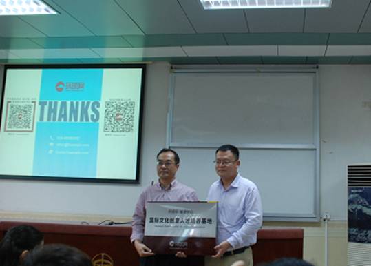 讨论结束后,两位来宾和学校领导在热烈的氛围中合影留念。接着,在来宾给我校学生做环球网实习宣讲之前,石丁先生为我校进行了“环球网国际文化创意人才培养基地”的授牌。