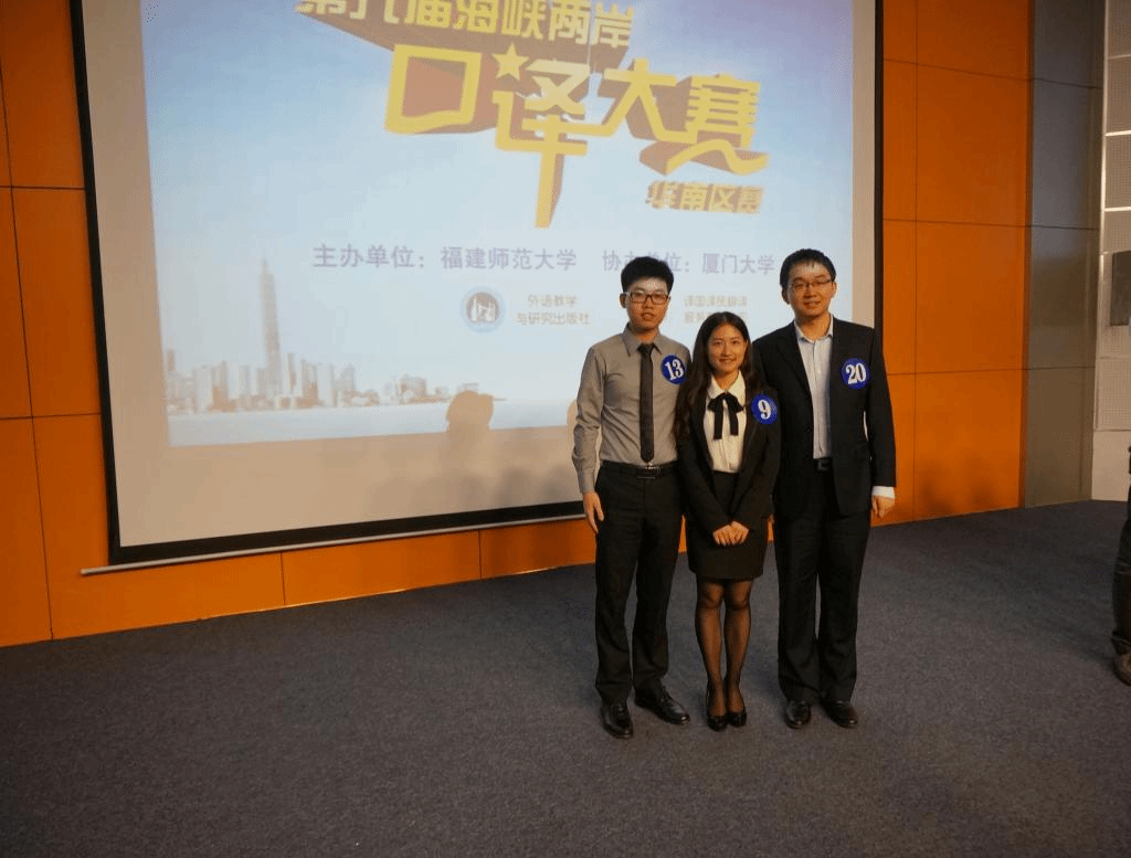 2015年11月15日,由福建师范大学主办、厦门大学协办的第六届海峡两岸口译大赛华南地区区级赛在福建师范大学外国语学院多功能厅圆满落幕。来自福建、广东、广西、海南四省高校的50名选手参加了本次大赛。由贾兰兰和欧阳倩华老师带队,来自广东外语外贸大学高级翻译学院2014级国际会议传译班的研究生邓长峰、蒋清宇和刘瑜文诗三位同学从众多参赛者中脱颖而出,分别斩获了华南区赛的一等奖和二等奖。
