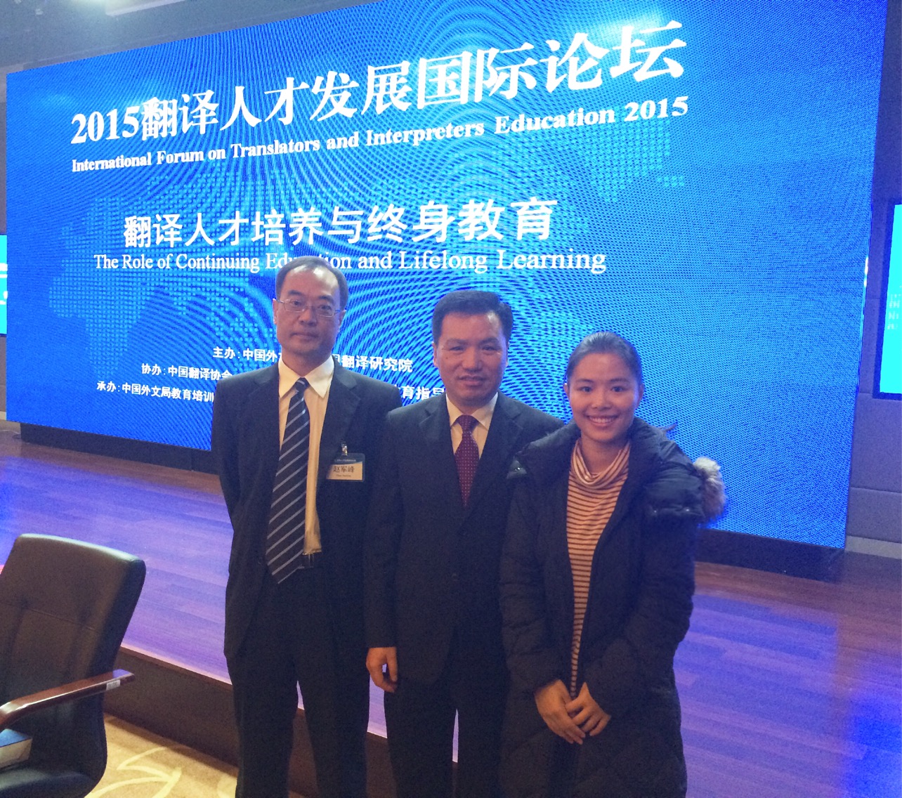 2015年12月12日至13日,首届翻译人才发展国际论坛在北京日坛宾馆举行,我院赵军峰院长、全国翻译专业学位研究生教育指导委员会秘书长平洪教授和博士生许艺应邀参加此次论坛。