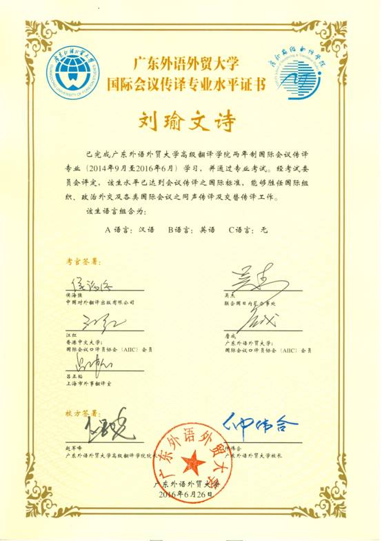 经过两天考试,广外国际会议传译证书班2016届学员中,共有4人全科通过,获颁“广外国际会议传译专业水平证书”;其余5名同学获得“广外国际会议传译专业结业证书”。