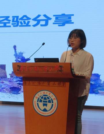 紧接着,2017年暑假在联合国实习过的16级MTI王艺璇同学就她亲身的实习经历进行了介绍。她分别从报名准备、工作及在纽约生活三个方面进行了介绍。首先,她分享了选择去联合国实习的原因并鼓励同学们大胆尝试。在对申请报名事项进行介绍时,她提到了填写申请表的一些具体问题,并提醒同学们注意报名时间,注册报名宜早不宜迟。关于机票、护照和签证的问题,她结合自身经历给同学们进行了讲解。随后,她介绍了自己在联合国实习期间工作方面的一些情况。她说到,实习生在实习期间工作量并不是特别大,同时还有许多与老师交流学习的机会。同时她还向同学们展示了她的工作环境并介绍了一些工作内容。最后,她讲述了自己在纽约的生活并通过自身经验就实习期间生活费用的支配等给出了建议。