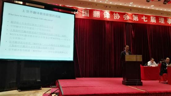 会前,中国翻译协会举办第七届二次理事会议,中国翻译协会理事、法律翻译委员会副主任委员、全国翻译专业学位研究生教育指导委员会秘书长、世界翻译教育联盟秘书长赵军峰教授应邀作译协理事工作汇报,向大会报告了我校倡导发起的世界翻译教育联盟在过去一年对翻译专业教育发展所做出的贡献,并探讨了翻译教育国际化的创新思考。参加理事会议的还有仲伟合教授、穆雷教授、蓝红军教授。