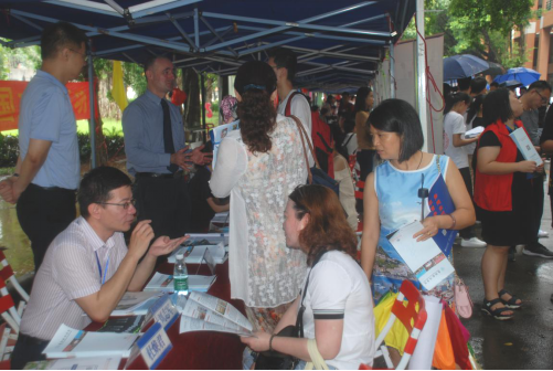 从上午9点开始,学院咨询处前的考生及家长络绎不绝,淅淅沥沥的雨点也阻挡不了家长与考生的热情。本次咨询活动中,考生和家长最为关注的问题有我院录取分数线、教学特色、就业情况以及“宗岱班”招生情况等,学院老师和学生志愿者都耐心地进行了解答。现场不少考生都表示想报考翻译专业,还有在读高二的学生家长过来咨询,提前了解学院录取分数线、专业特色等情况,为明年高考的孩子做好准备。