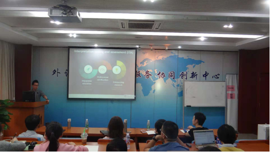 韩潮教授首先介绍了口译测评的特点及相关行业和机构,强调口译认证、测试、评估对口译行业发展的重要性,及其不可忽视的反拨作用(washback effect)。