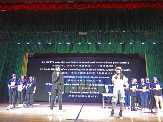 而本科1701班结合流行唱法与rap的音乐剧《我爱高翻》更是让人印象深刻,讲述高翻学生的日常学习和生活,歌词幽默有趣,每一句都道出了同学们的心声,现场氛围被再度推向高潮。紧接着,翻译1701、1702、1703、1802和1803的同学们则带来了动感十足的舞蹈串烧节目Unknown,活力四射的舞姿使现场氛围持续火热。最后,校歌队为现场观众带来了极具故事张力的压轴歌曲Save Me fromMyself和《不该》。