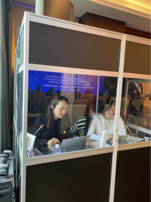 本次论坛开幕之前,我院学子接到任务安排,在王巍巍老师、张丽华老师和张凌老师的指导下,在会议之前做好详细的分工安排。在会议开幕前到达会场,有条不紊地开始会场的准备工作。在论坛开幕之后,同学们积极地配合会务组的相关工作。同时,为了配合同传老师更好地提供口译服务,同学们还积极与发言嘉宾沟通,以便提前拿到发言材料交付给同传老师,辅助老师的译前准备工作。在这三天的工作时间内,学院师生展现了高翻人认真负责、从容淡定的风采,代表广外为本次论坛的顺利召开贡献了自己的一份力量。他们的职业素养和工作态度获得了主办方、承办方和外宾的一致好评。