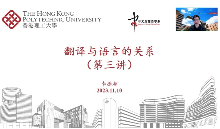2023年9月至12月,世界百强大学香港理工大学教授、博士生导师、中文及双语学系副系主任,香港翻译学会会刊《翻译季刊》主编李德超教授应邀线上开展 “语言学视域下的翻译学研究与翻译学科发展”系列讲座。该系列讲座为广东外语外贸大学海外名师讲学项目,由广东外语外贸大学高级翻译学院苏雯超副教授负责。此次系列讲座中,李德超教授开展了五场演讲,分别为“翻译与语言的关系”、“语言与翻译的关系——翻译的语言研究”、“翻译与语言的关系——语言学翻译理论”、“翻译与语言的关系——语言对翻译实践与研究的影响”以及“语言学翻译研究的未来发展”,吸引了校内外众多翻译学习爱好者。